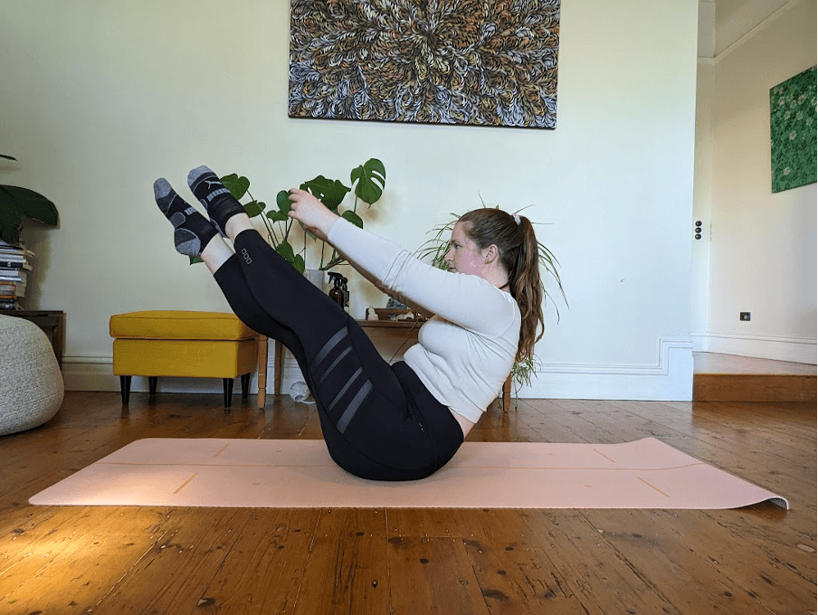 Mat Pilates uses body weight and the ground as the primary equipment. This makes it easier to perform at home or travelling. It’s performed on a mat to give a little cushioning and grip for your body on the floor. The main resistance comes from gravity and your body weight, as well as resistance bands where needed.