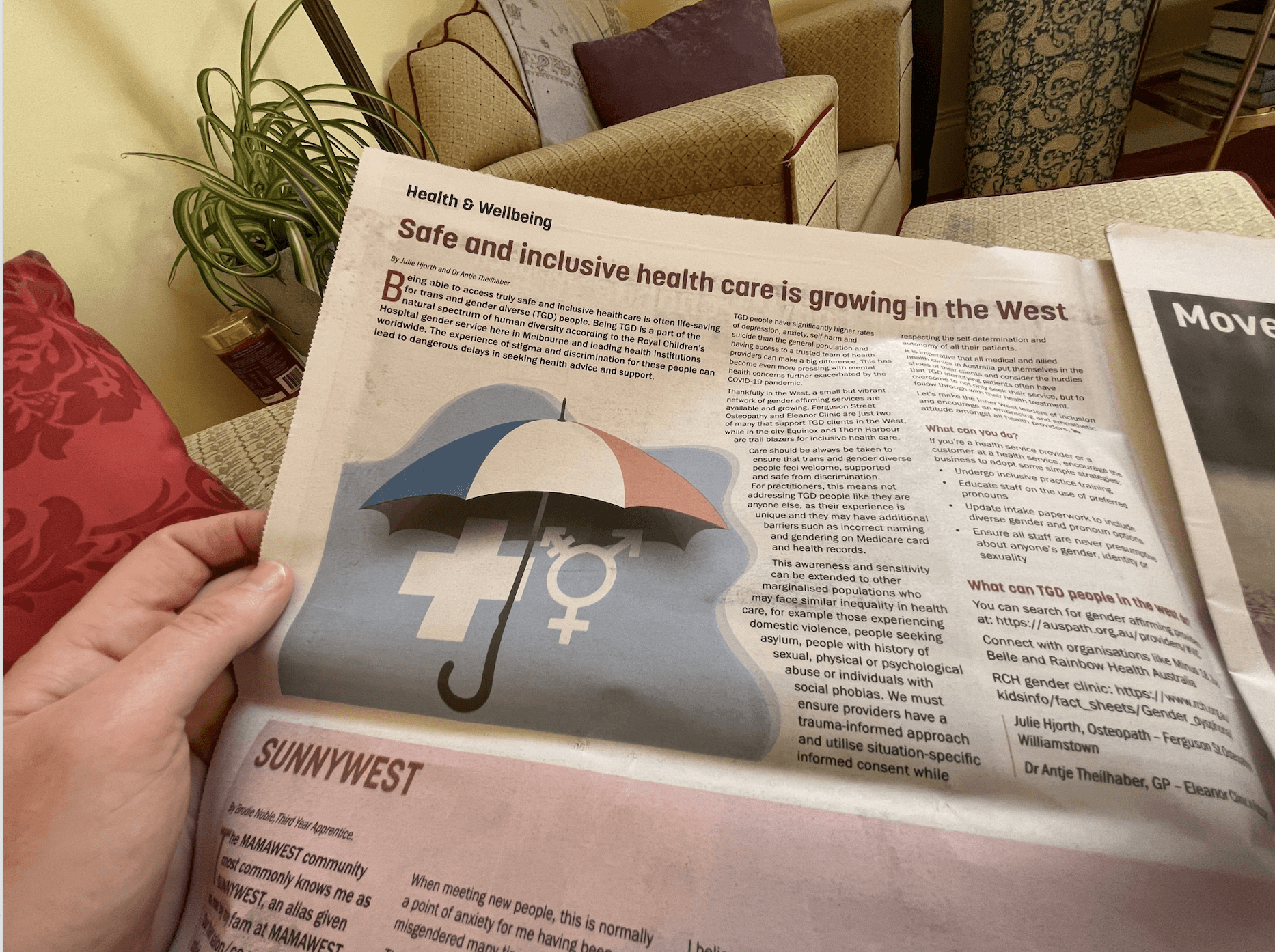 Julie worked with Dr Antje Thielhaber from the Eleanor clinic to pen an article encouraging clinics in Melbourne’s West to lead the way in inclusive practice. It was published by The Westside newspaper in August 2022.